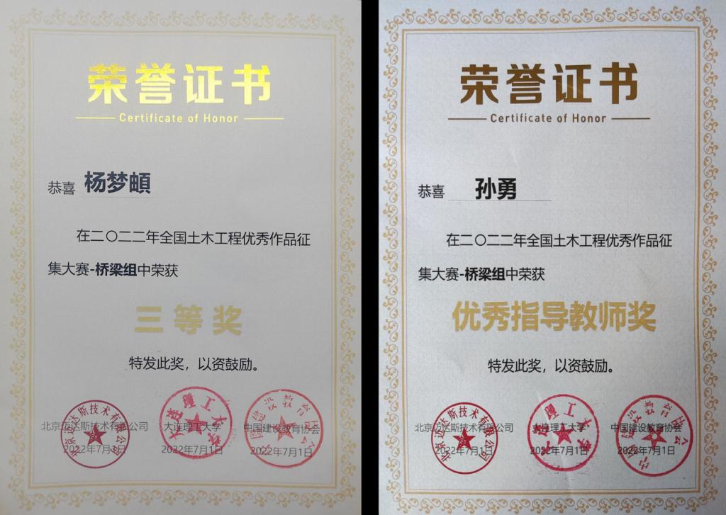近日,由中国建设教育协会校企合作专委会主办,大连理工大学承办,北京迈达斯技术有限公司协办的“2022年全国土木工程优秀作品征集大赛”线上决赛落下帷幕并颁发了获奖证书。我院教师孙勇指导的道路桥梁与渡河工程2018级杨梦頔同学,获得桥梁组全国三等奖,参赛作品为该同学的毕业设计《佳木斯松花江特大桥冬季施工大体积混凝土温度效应分析》。