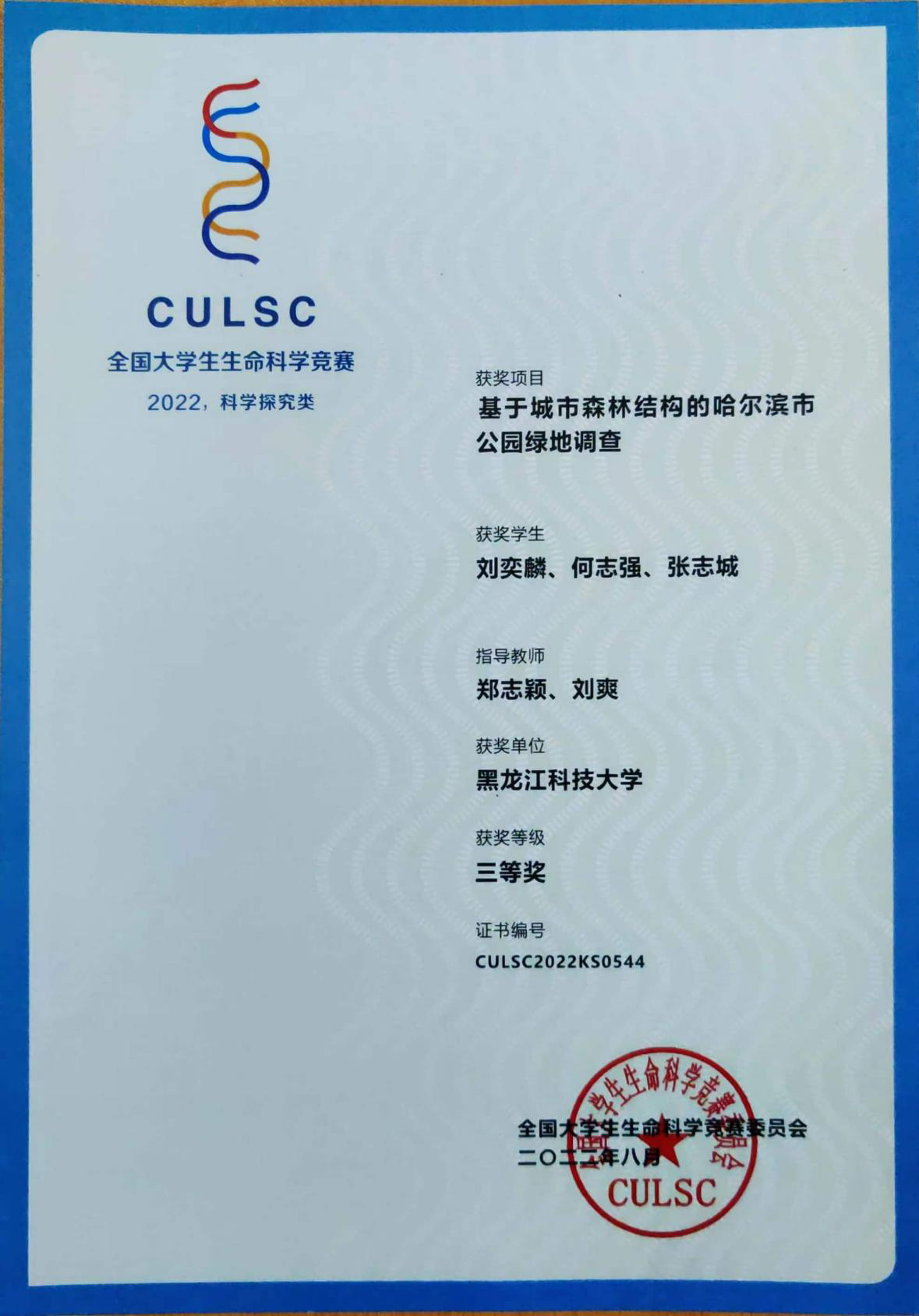 近日,由全国大学生生命科学竞赛委员会、高等学校国家级实验教学示范中心联席会及《高校生物学教学研究(电子版)》杂志社主办,由河南师范大学承办的2022年全国大学生生命科学竞赛(科学探究类)决赛落下帷幕,我院教师郑志颖、刘爽指导风景园林专业学生刘奕麟、何志强、张志城完成的参赛作品“基于城市森林结构的哈尔滨市公园绿地调查”在比赛中获得三等奖。