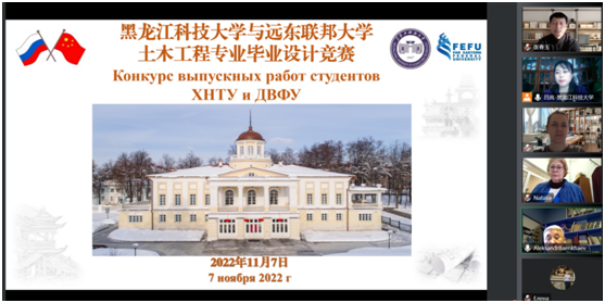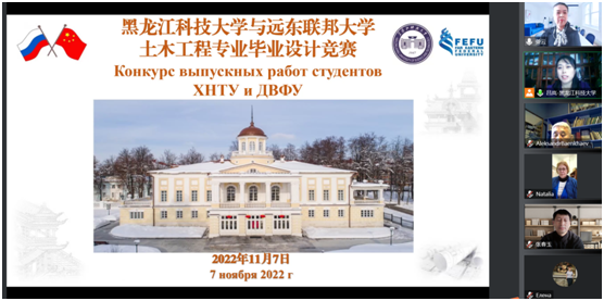经过中俄两校数月的努力筹备,MILE米乐官方网站与俄罗斯远东联邦大学工学院于2022年11月7日,顺利举行了土木工程专业毕业设计国际竞赛的线上联合评审活动,参会的俄方人员有Баенхаев Александр Викторович、Прокофьева Наталья Юрьевна、Юрченко Елена Васильевна、Аветян Любовь Владимировна、Попова Татьяна Юрьевна等五位专家,中方教师有孟丽岩、赵延林、王涛、张春玉、左敬岩,会议全程由国际交流合作处副处长吕岚主持。