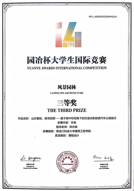 第十四届园冶杯大学生国际竞赛决赛在南京落下帷幕,本届竞赛,由园冶杯国际竞赛组委会主办,中央美术学院、日本九州大学、南京林业大学、法国拉维莱特大学、韩国江陵原洲国立大学联合协办。我校风景园林专业获得课程设计类三等奖一项、主题竞赛类荣誉奖一项。