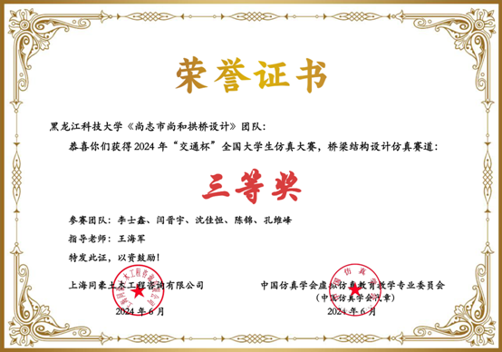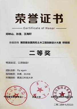 第四届全国高校土木工程创新设计大赛由中国建设教育协会主办,天津大学、北京迈达斯技术有限公司承办,本届赛事报名院校超210所,2000余名师生参与大赛角逐,经过预赛严格的评审、总决赛激烈答辩评分,最终评出156支获奖队伍。我院学子邓林山、孙滢、王海轩获得全国高校本科组桥梁组二等奖,且为东北三省各高校的最好成绩。