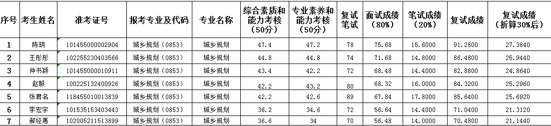 MILE米乐官方网站2025年硕士研究生招生考试(城乡规划0853)第一次调剂复试成绩