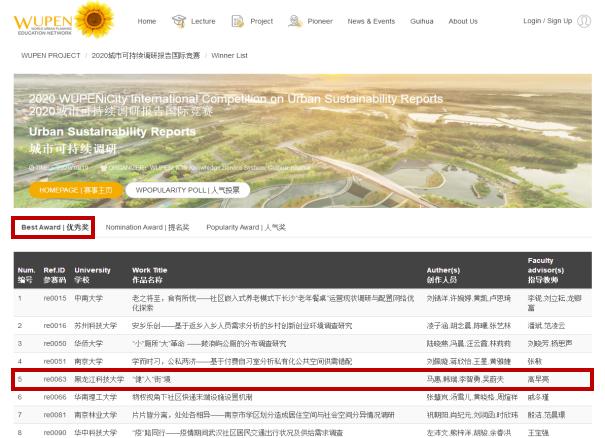 本次竞赛全部以线上方式进行。共有同济大学、清华大学、北京大学等几十所一流高校均参与了竞赛角逐,部分国外院校也参与了这一盛事。历经3个月评审工作,最终有335份作品进入专家评审,共评出优秀奖23份,提名奖199份。我校城乡规划专业学生在本次竞赛中表现优异,共获优秀奖1项、提名奖4项。获奖情况在黑龙江参赛高校中名列第二名,再创我校城乡规划专业参加该类竞赛的优异成绩。