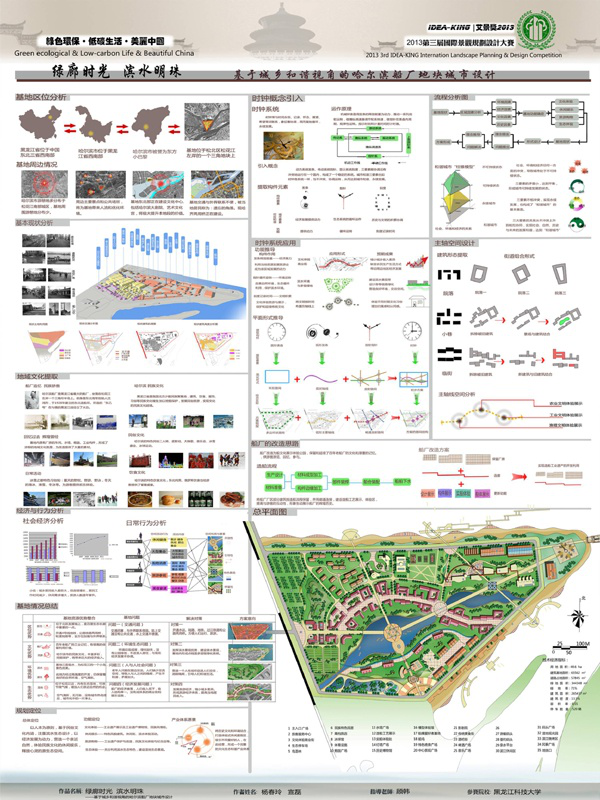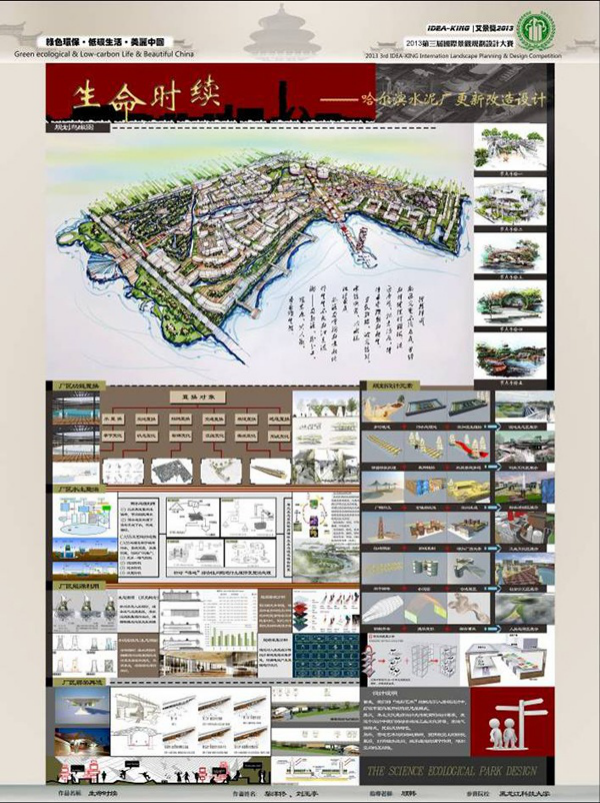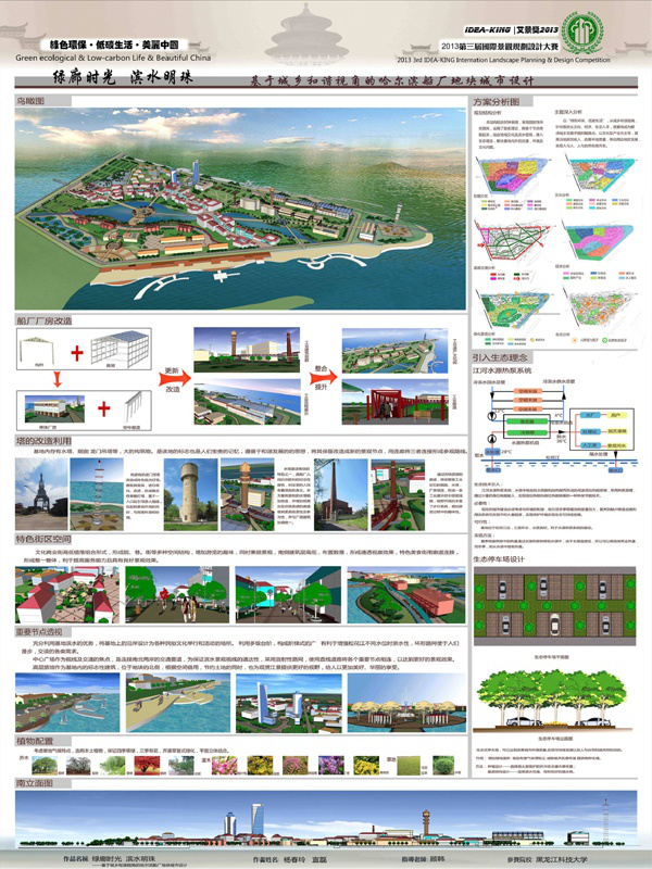 2013年3月18日至10月30日举行了2013年“艾景奖?第三届国际景观规划大赛”,该项赛事由国际园林景观规划设计行业协会(ILIA) 、 中国建设报社、北京林业大学教育基金会等共同主办。大赛以“绿色生态?低碳生活?美丽中国”为主题,内容涉及城市规划设计、旅游度假区规划、居住区环境设计等方面。本次大赛中,同济大学、东南大学、哈尔滨工业大学、华南理工大学、墨尔本皇家理工大学、韩国首尔大学等184所国内外高校、共计5618个组别参加了本次比赛。我校MILE米乐官方网站城乡规划专业(原城市规划专业)的学生首次参加了此次比赛,在李冬梅、夏宏嘉等老师的指导下,我校4名学生凭借优秀的方案设计能力、过硬的图面表现能力及良好的心理素质,经过层层评选,激烈的竞争,最终获得骄人的战绩。黎洋佟、刘玉亭设计的“生命时续”——哈尔滨水泥厂更新改造设计,宣磊、杨春玲设计的“绿廊时光 滨水明珠——基于城乡和谐视角的哈尔滨船厂地块城市设计”均获得此次大赛城市规划设计组的银奖,开创了我校在此类国际大赛中获得优异成绩的先例。